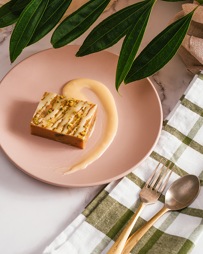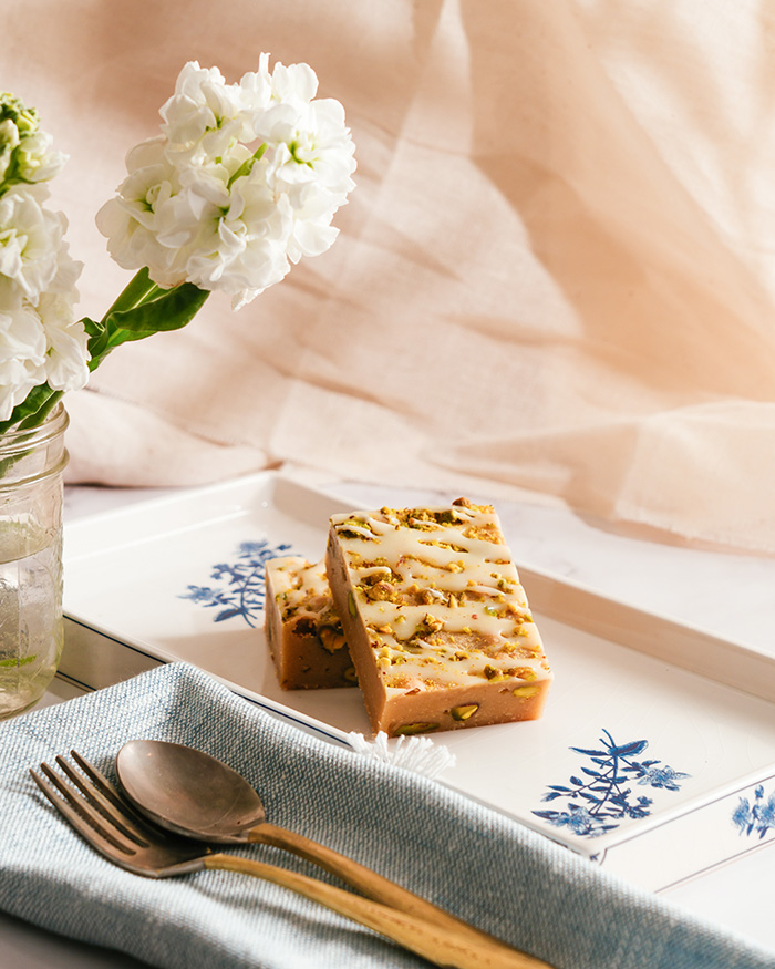 Une blondie à « huile d’olive » blonde délicieusement unique chargée des morceaux de pistaches addictives et parfaitement garnis de notre miroir signature en chocolat blanc.